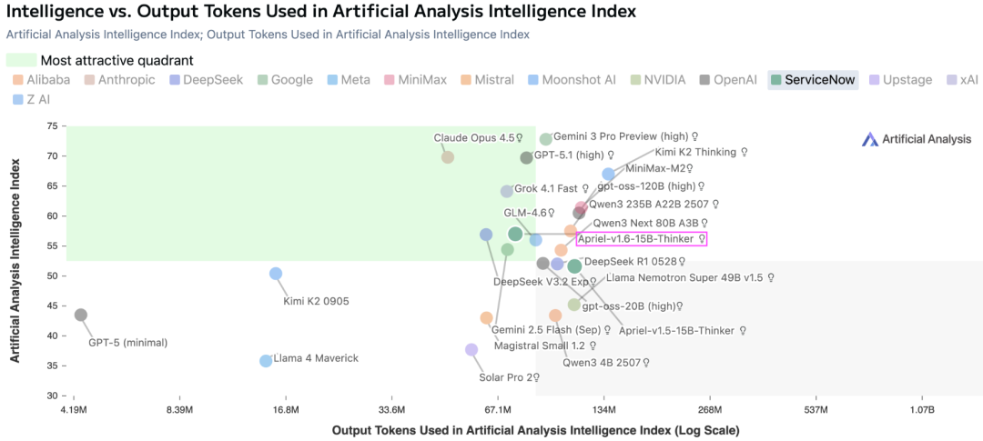 Apriel-1.6在保持甚至提升推理深度的同时,成功将推理Token的使用量减少了30%以上。