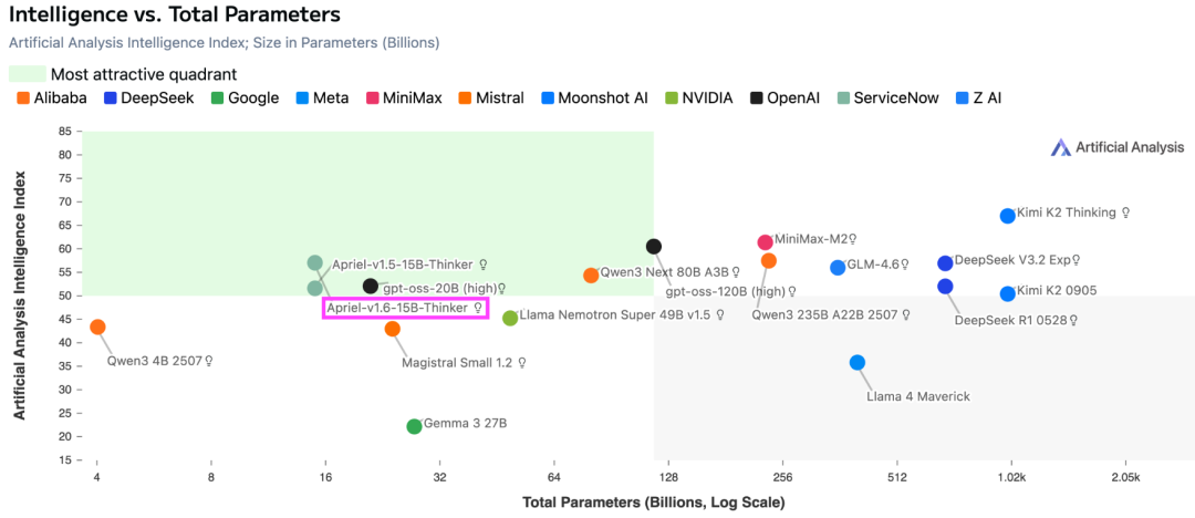 在智力与参数量的对比图表中,它位于最吸引人的象限:以150亿参数提供了媲美巨型模型的智力分数。