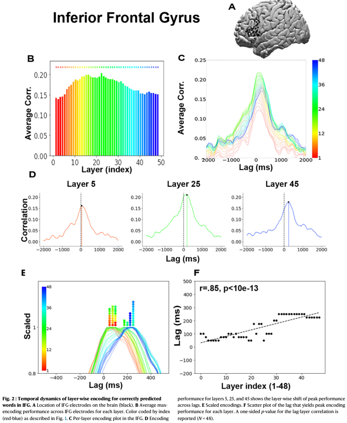 对于下额叶回(IFG)中的每个电极,研究针对GPT-2 XL的每一层(1-48层)在每个滞后时间(-2000毫秒至2000毫秒,以25毫秒为增量)进行了编码分析。