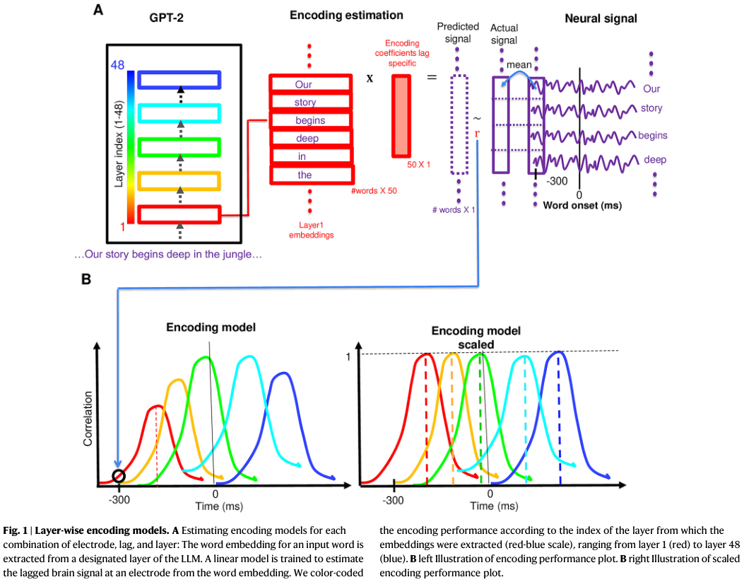 研究人员将大语言模型层级间的内部嵌入序列映射到人类受试者在自然语言理解过程中记录的神经反应上。