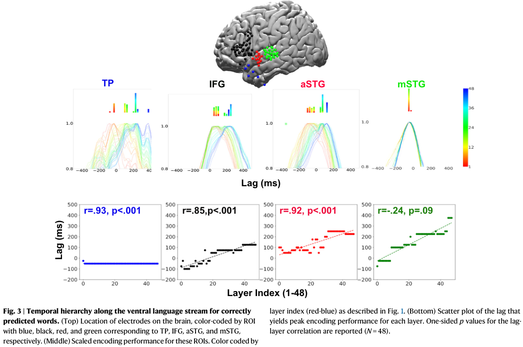 虽然基于Transformer的大语言模型按层顺序处理词汇,但研究发现了人类大脑中类似顺序处理的证据,但这是在给定的皮层区域内相对于词汇出现的时间而言的。例如,在高级语言区域(如IFG和TP),时间处理序列对应于大语言模型中的逐层处理序列。