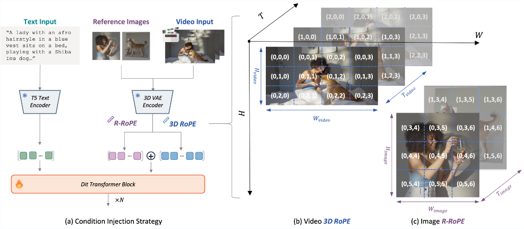 R-ROPE机制对参考图像的Token进行了独立的旋转位置编码。通过显式的空间位移,模型在计算注意力时,能够清晰地划定不同主体与视频帧之间的边界。