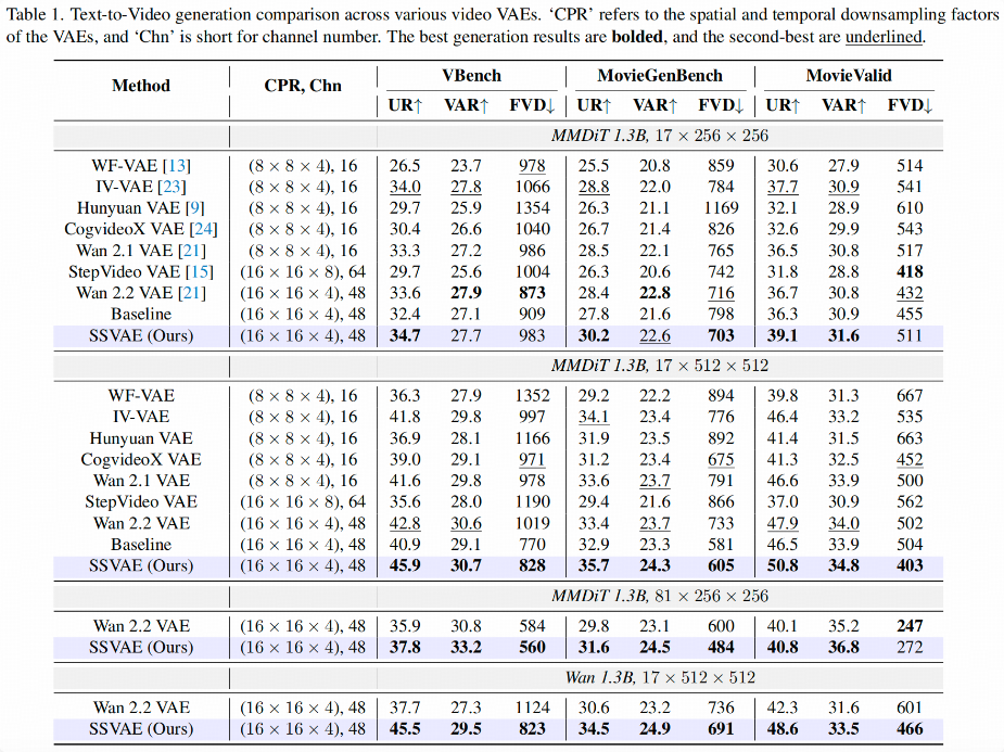 更令人惊叹的是,SSVAE仅需1.3B参数量的扩散模型,便能在性能上超越基于Wan 2.2 VAE的4B参数量模型。