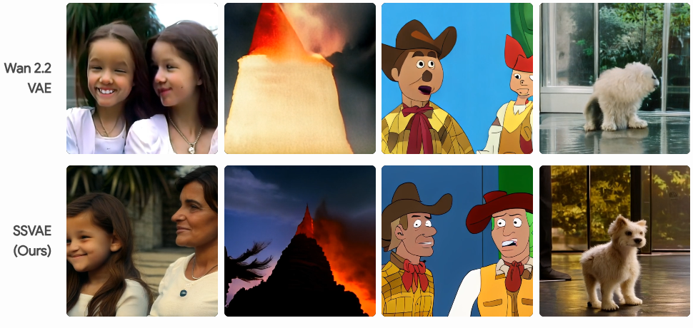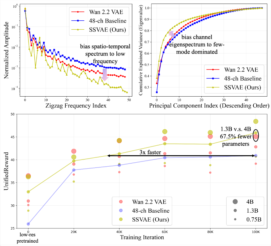 SSVAE通过谱正则化,在训练收敛速度和 Video Reward 上相对于 Baseline 的显著提升,超越Wan 2.2 VAE。