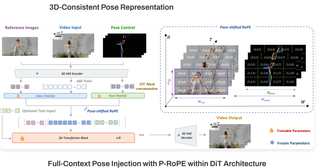 SCAIL在DiT(Diffusion Transformer)架构中引入了全上下文姿态注入机制(Full-Context Pose Injection)。它通过Pose-Shifted RoPE(姿态偏移旋转位置编码),在序列维度上区分控制信号。