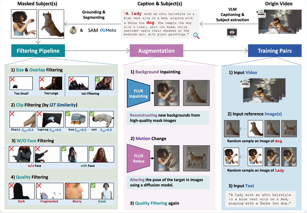 通过背景修复与运动增强技术,团队合成大量跨配对训练数据。训练过程中,模型看到的是同一个主体出现在完全不同的背景和姿态中。