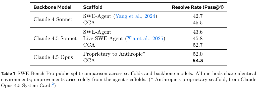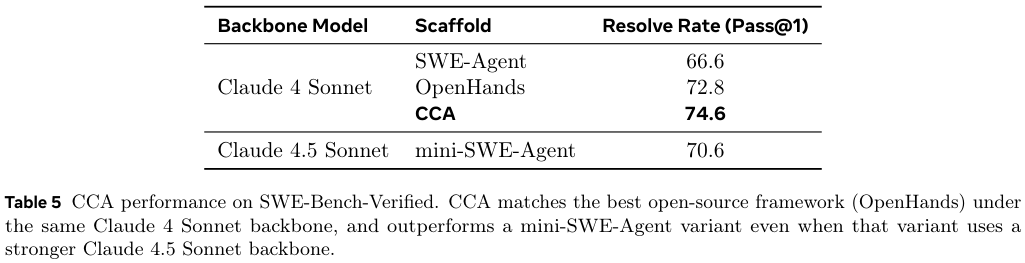 在SWE-Bench-Pro基准测试中,使用Claude 4.5 Sonnet作为基座模型的CCA,达到了52.7%的解决率(Resolve@1)。