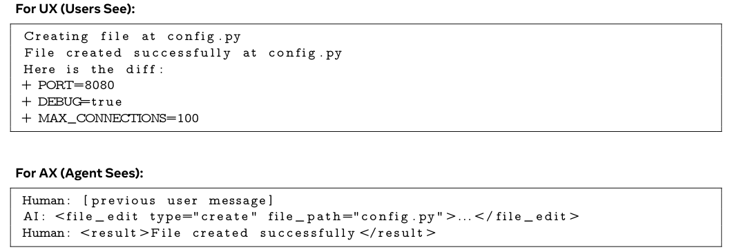 AX(模型看): 模型接收到的并不是那一大串Diff文本,而是一个压缩后的结构化信号:Action: file_edit, Status: Success。