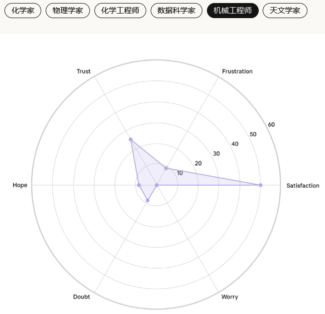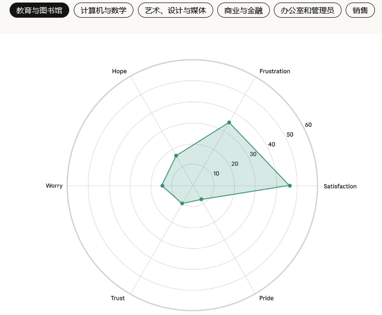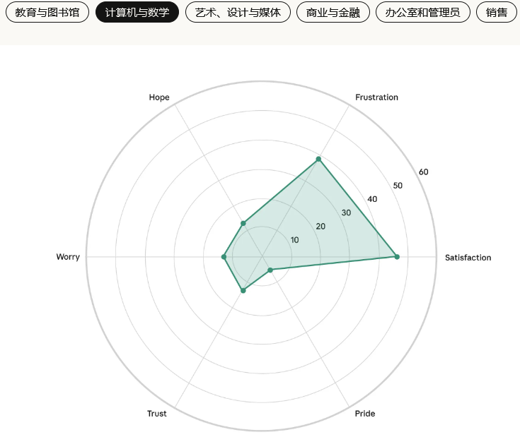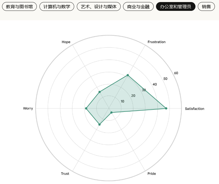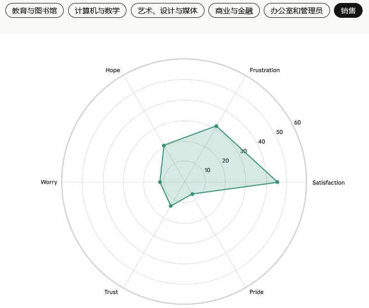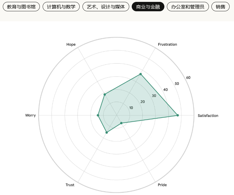 以下是各个职业领域的六种情绪的强度:信任,期待,怀疑,担忧,满意,挫败。