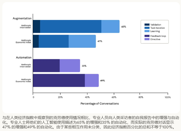 Anthropic的后台经济指数分析却给出了不同的答案:实际的对话记录显示,增强式和自动化用途几乎各占一半,分别为47%和49%。
