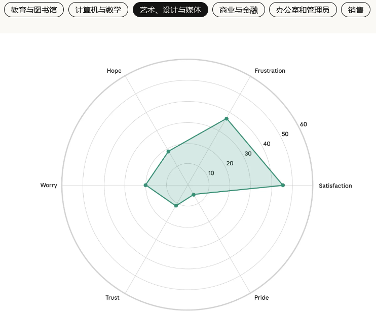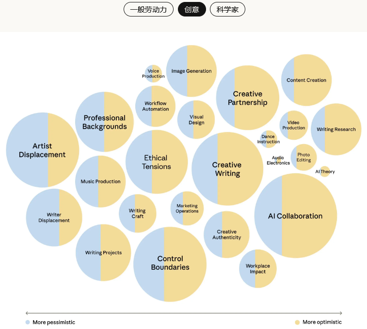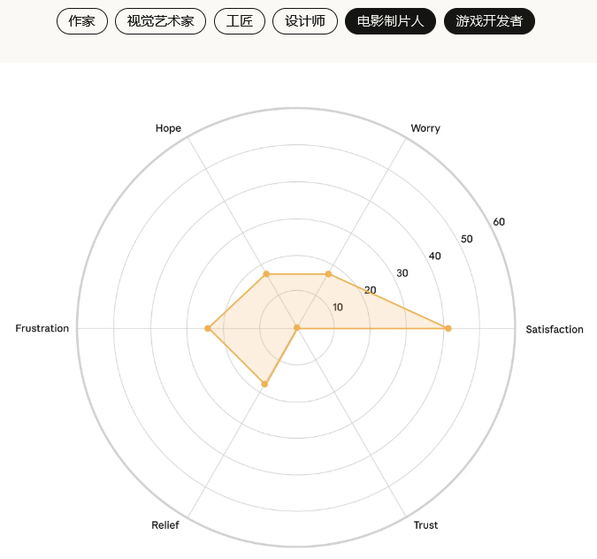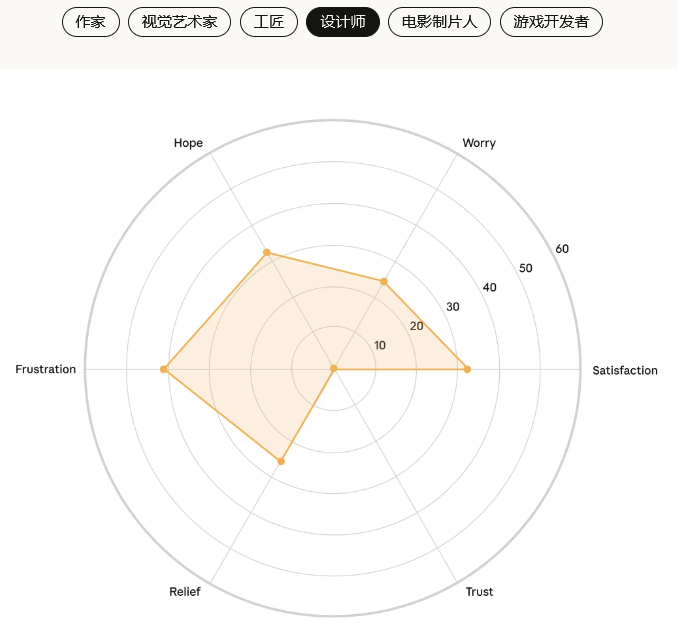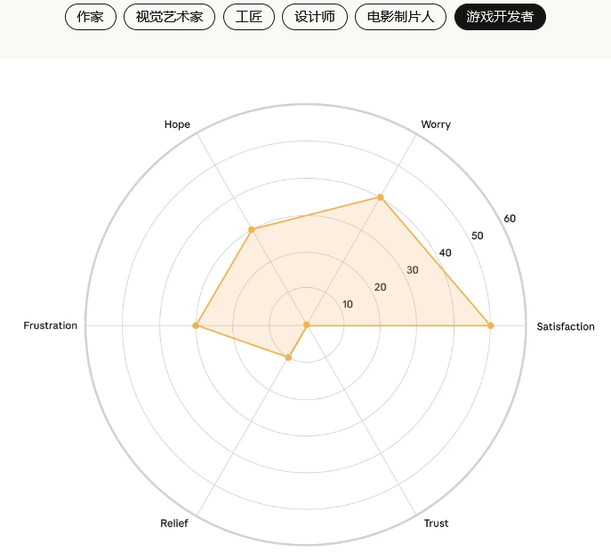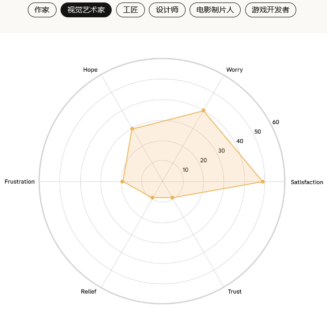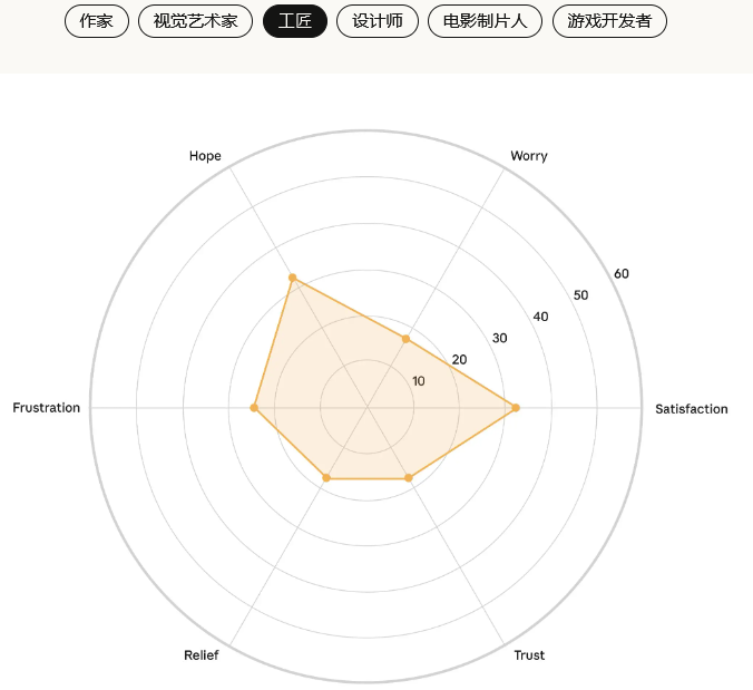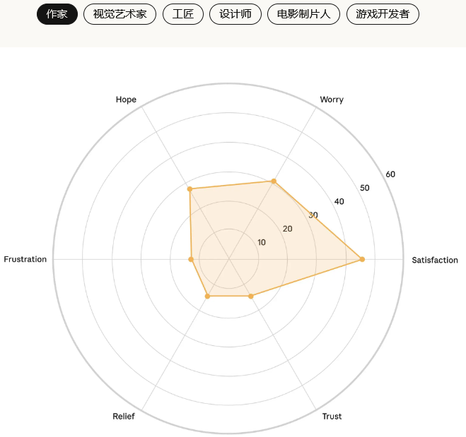 信任感在所有创意职业中都普遍偏低,这表明大家对AI长期影响的不确定性有着共同的担忧。