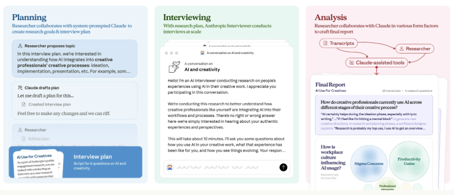 为了搞清楚人们在聊天框之外究竟如何使用AI,以及这些工具如何影响他们的职业生涯和心理状态,Anthropic开发了这个采访者。