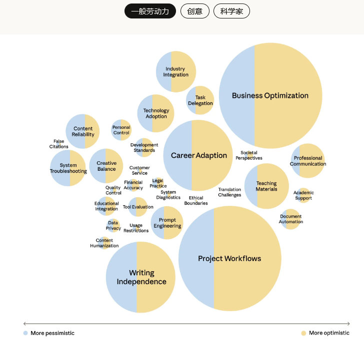 以下是一般工作、创意与科研3大领域不同方面从悲观到乐观的分布可视化。
