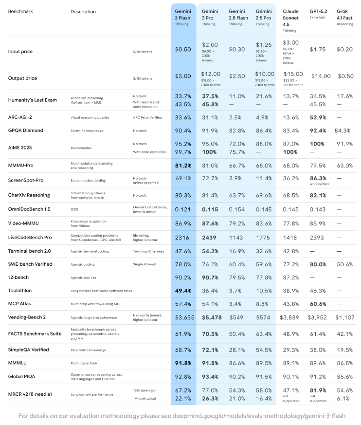 它不仅继承了Gemini 3 Pro级别的推理基础,还在延迟、效率和成本控制上保持了Flash系列一贯的优势。一些基准上甚至超越了Gemini 3 Pro。