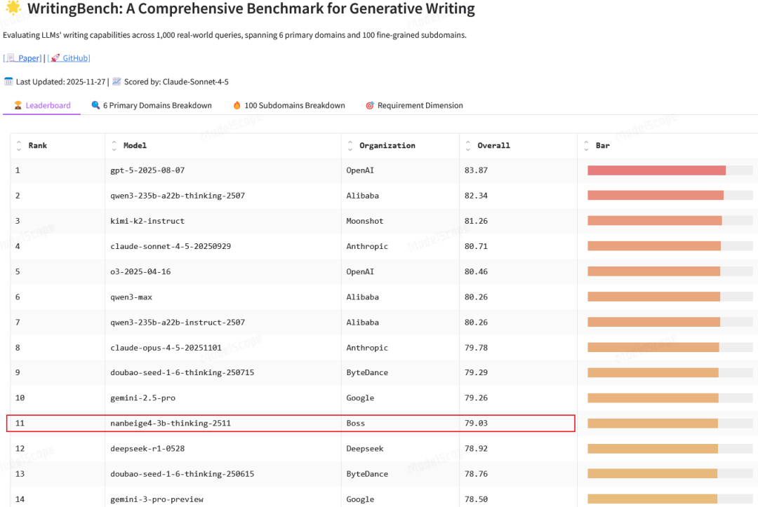 这种高效的信号反馈机制,让模型在创意写作和角色扮演等开放任务上的表现更加符合人类直觉。这让它在写作综合基准WritingBench上脱颖而出,与众多闭源、开源大模型比较排到了第11位。