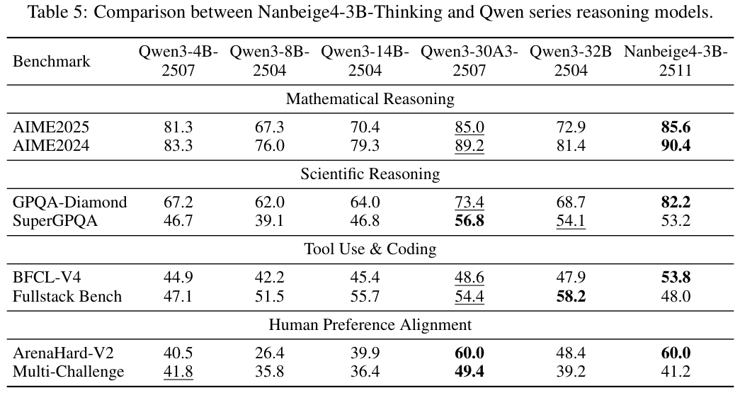 这种精细的数据工程让Nanbeige4-3B在SFT阶段就积累了深厚的内功,不仅保留了冷启动阶段的强推理能力,还在通用对话和任务执行上变得更加圆融。