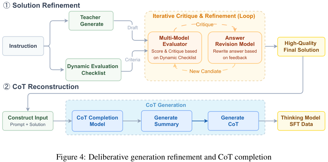 在这个阶段,团队设计了一套解决方案精炼与CoT重构的联合机制,专门解决复杂任务中答案质量与推理过程不匹配的问题。