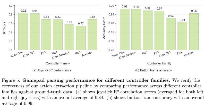 结果显示,该管道在提取摇杆位置时的 R2 分数达到了 0.84,按键状态的准确率高达 0.96,证明了从视频中反向工程玩家操作是高度可靠的。