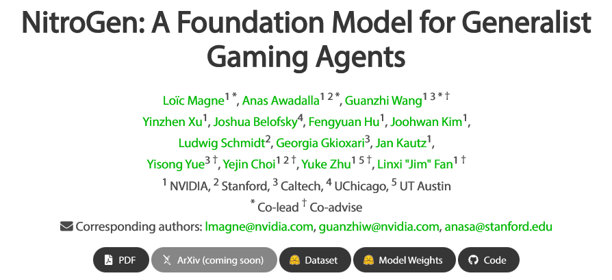 NVIDIA 发布 NitroGen 模型,通过从公开游戏视频中提取手柄操作指令,构建了目前规模最大的视觉-动作数据集,让 AI 能够在未见过的游戏中展现出惊人的泛化能力。