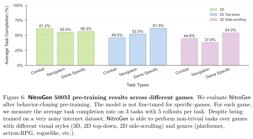 这意味着 NitroGen 确实学到了可迁移的通用技能,如看见敌人要攻击、看见障碍要躲避。
