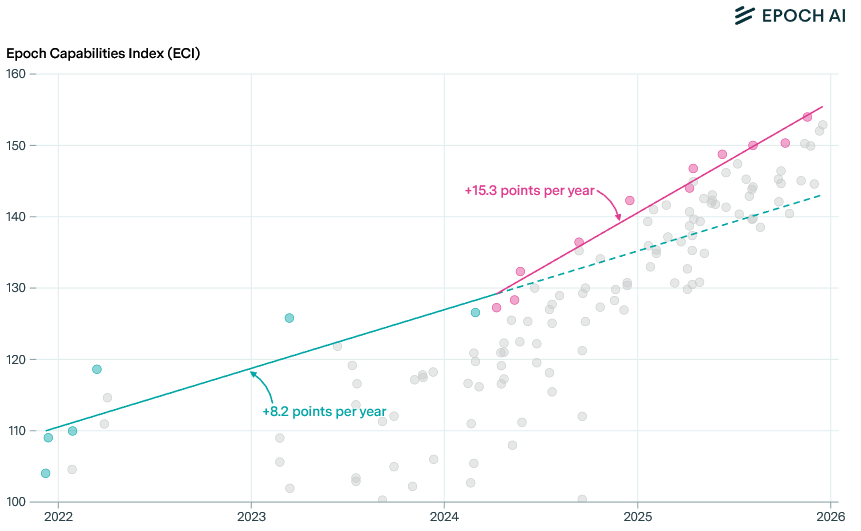 在过去的两年里,AI模型在Epoch能力指数(Epoch Capabilities Index,ECI)上的得分增长速度,几乎是此前两年的两倍。