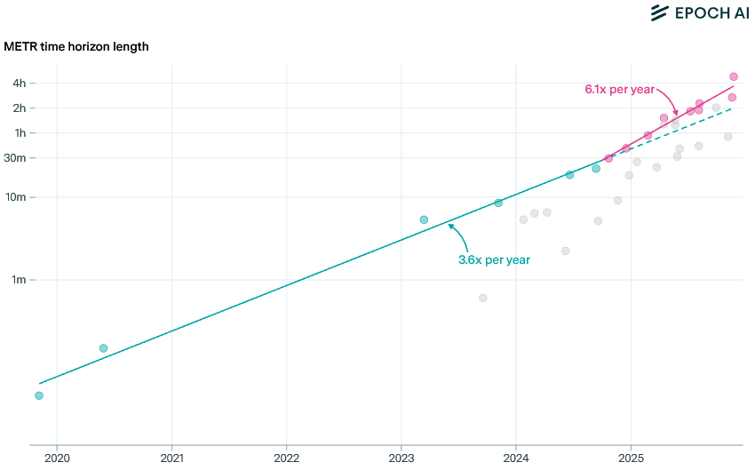 这与METR的时间跨度基准(Time Horizon benchmark)得出的加速结论遥相呼应。