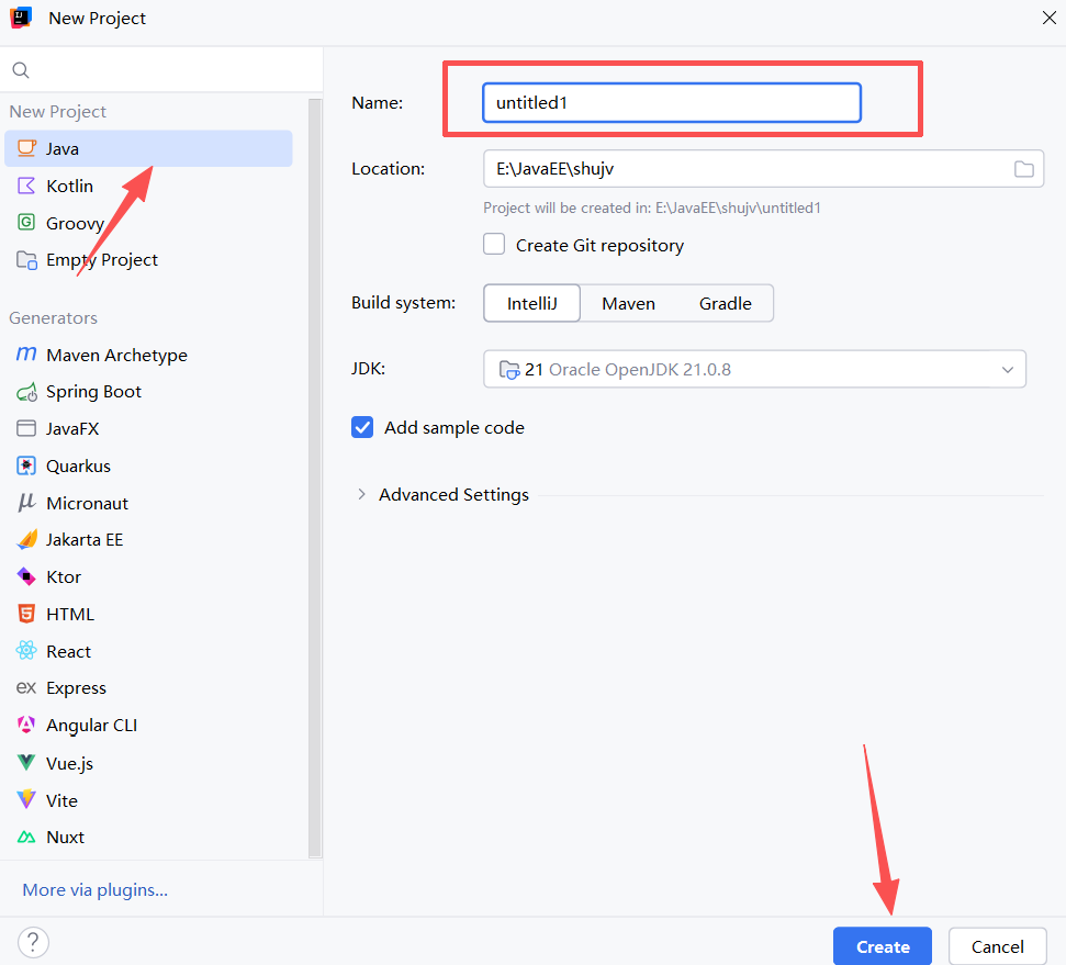 1.打开IDEA,File->new project,选择Java项目,右边选择对应JDK版本,点击create