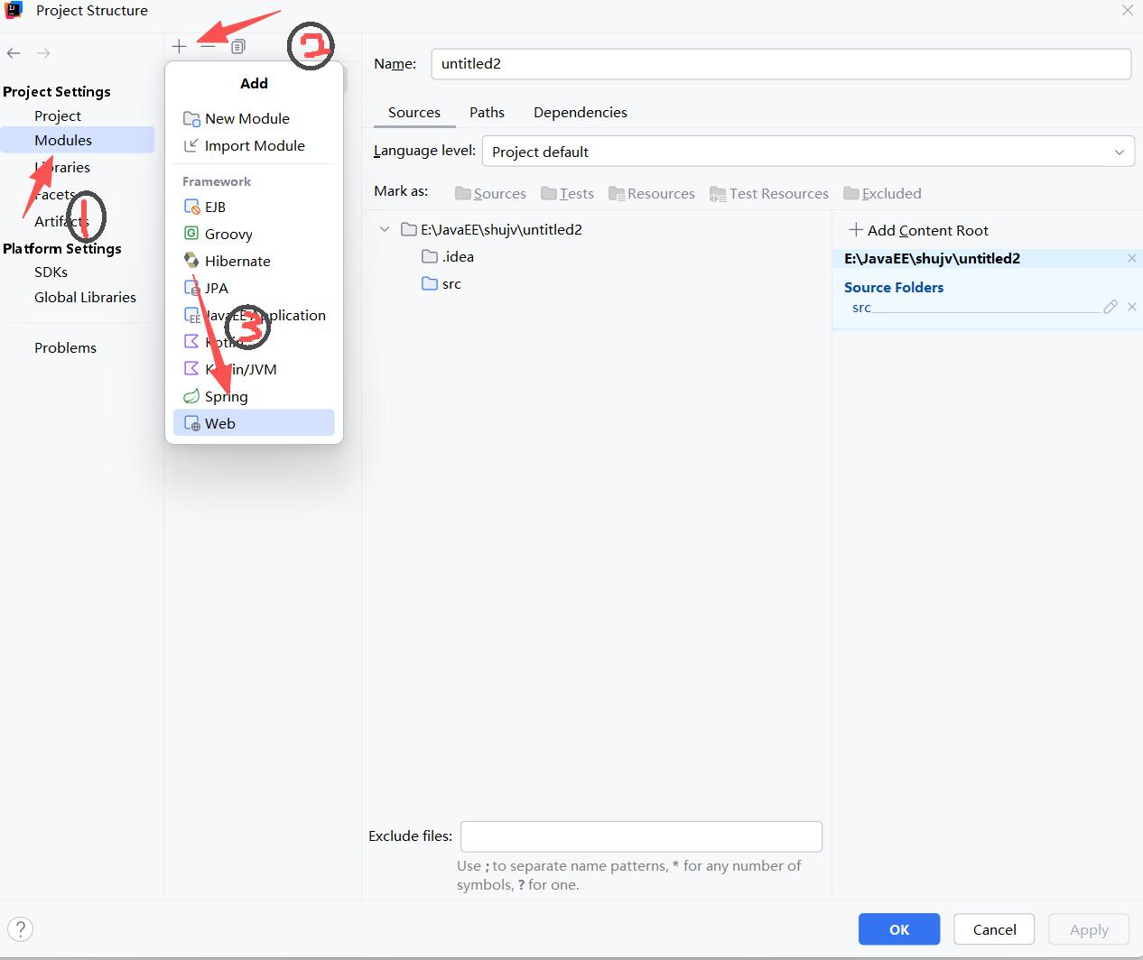 3.点击Moudles,按照图片中标注顺序操作即可