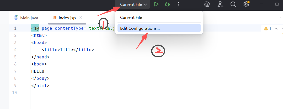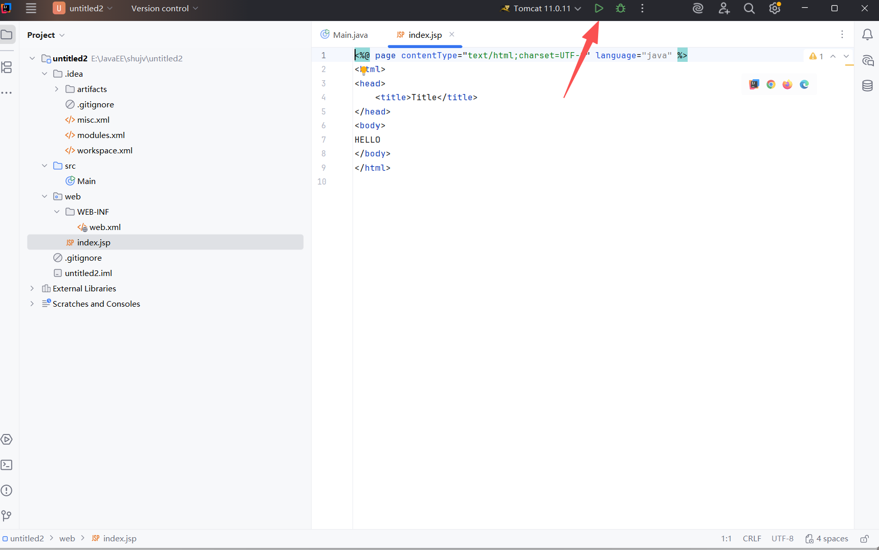 15.返回主界面便可以看见配置好的Tomcat,点击旁边三角号,运行JSP文件