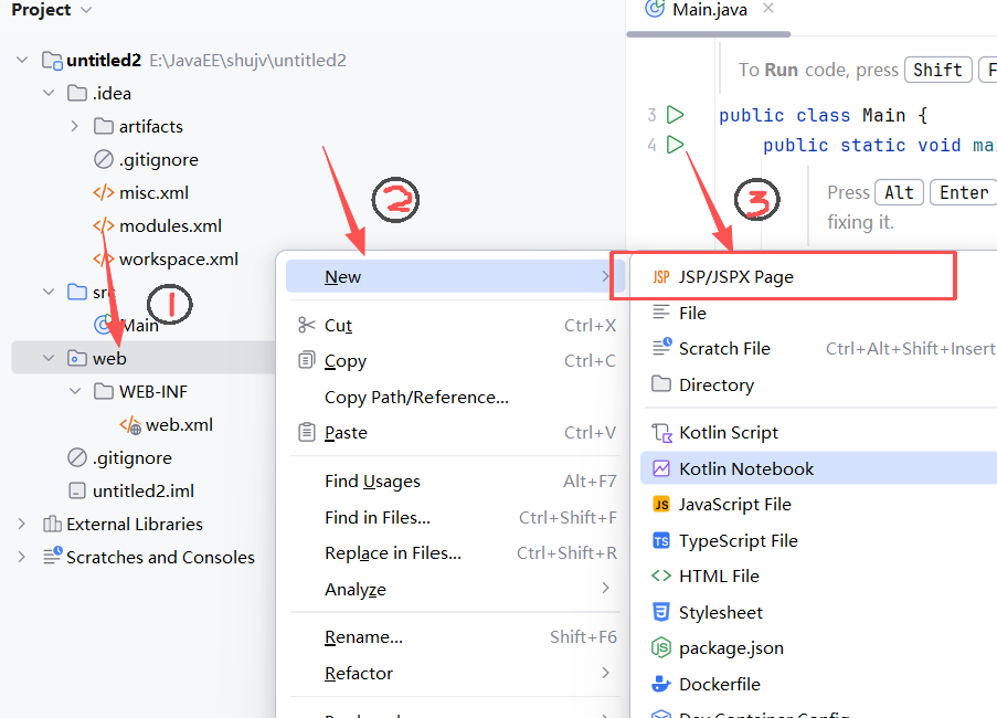 6.随后在web目录下右键new,选择jsp文件,注意不要建在WEB-INF目录下