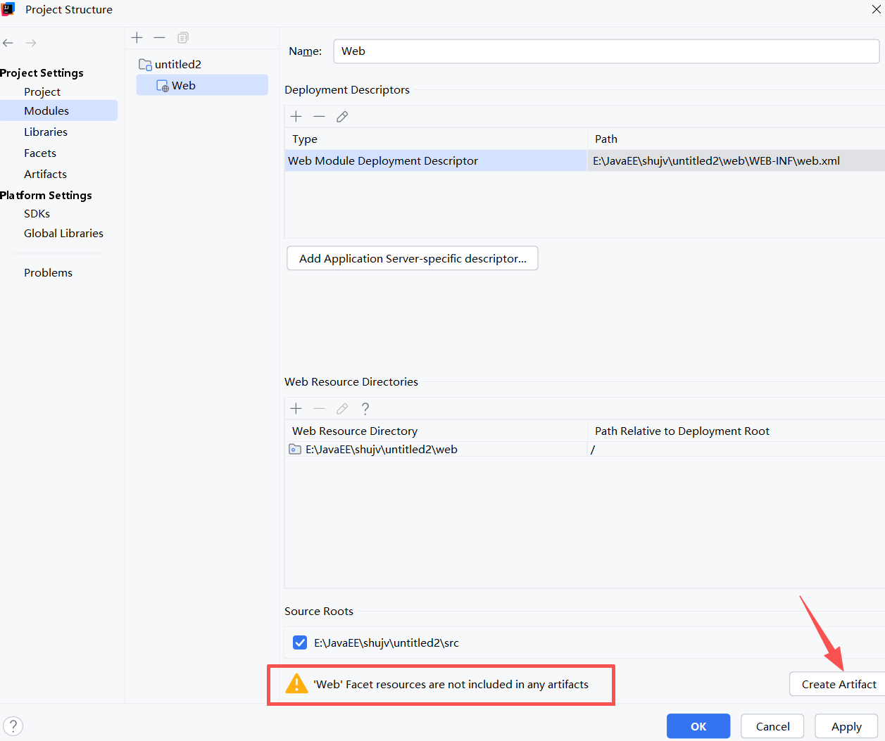 4.如出现警告,点击右侧Create Artifact