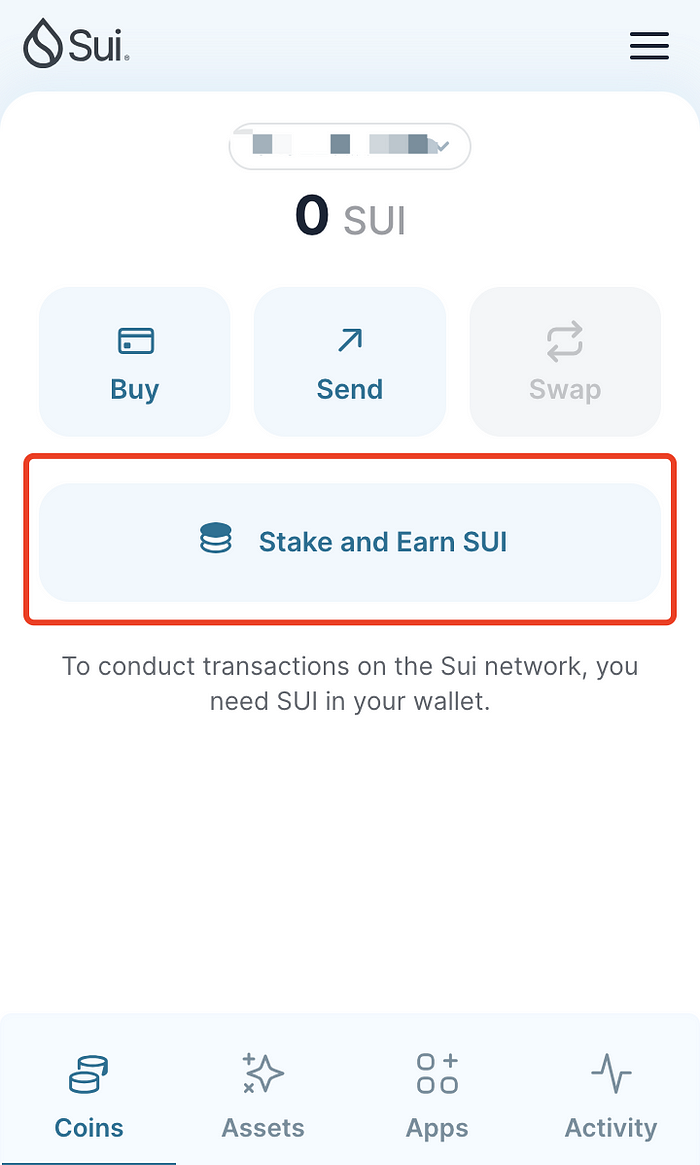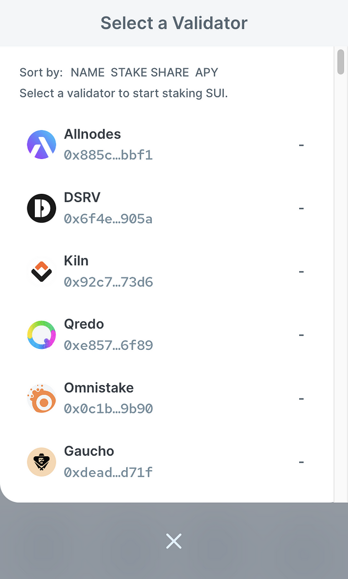 用户可通过钱包或其他 DAPP 选择信赖的验证节点,进行质押。下图为 Sui 官方钱包选择验证节点进行质押的操作示意图: