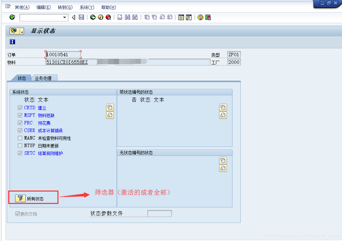 点击按钮” 状态”后,如下左图所示,系统默认将显示生产订单的当前有效状态(Active Status),点击按钮“过滤后,如下右图所示,系统将显示所有的状态,包括当前有效的和曾经有效的状态。 具体而言,对于生产订单10010541 当生产订单新创建时,其状态为CTRD