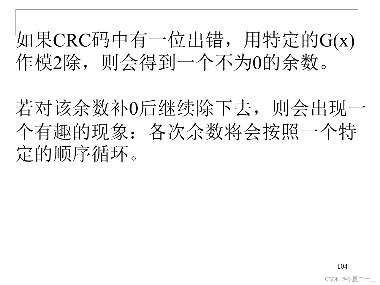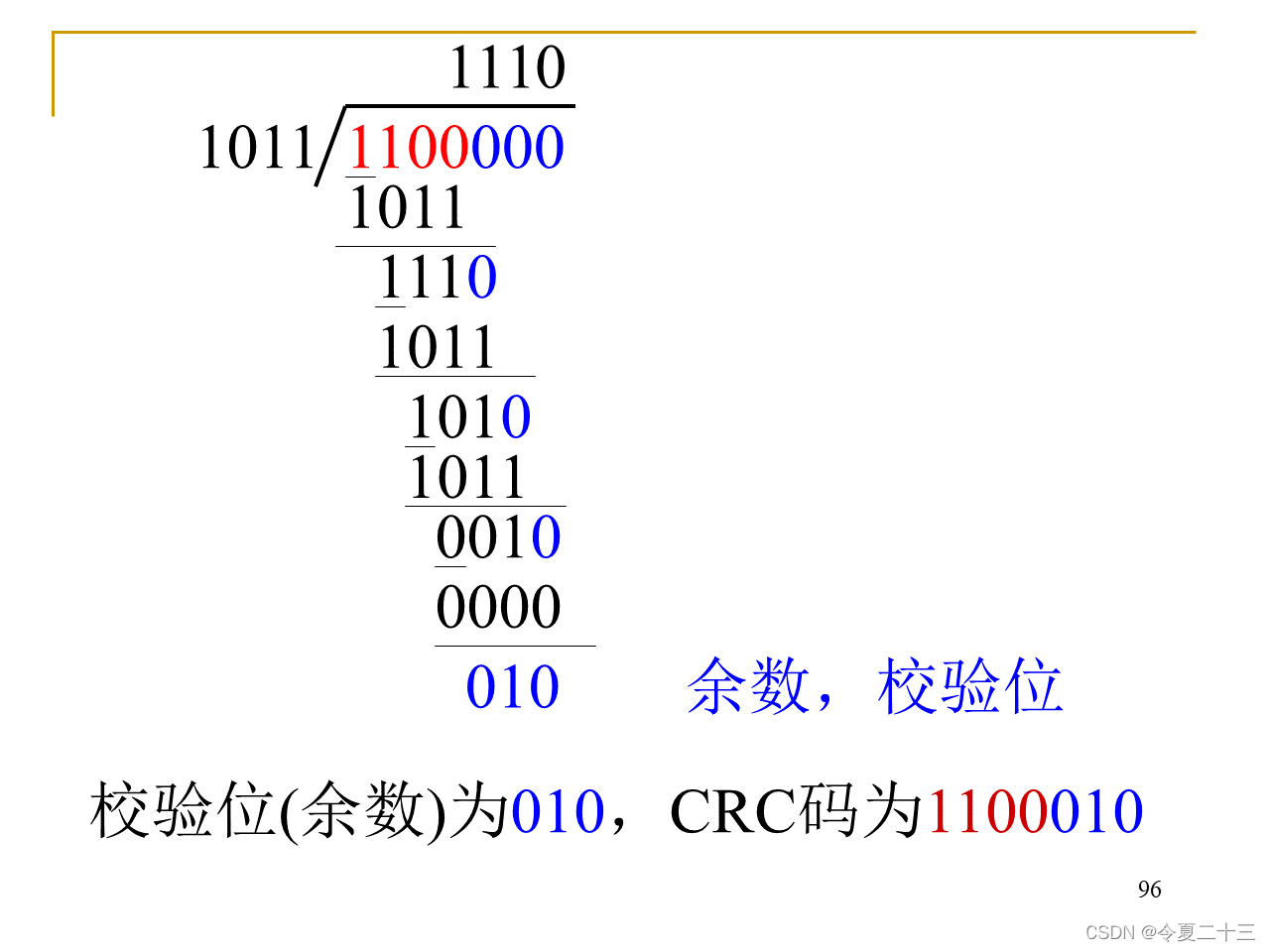 最后,在列式计算二进制除法的时候,要注意这里需要采用 “ 模2运算 ” ,模2运算时不考虑进位和借位,当部分余数首位时1时商1,否则商0。除到被除数位数用尽时停止,此时的余数就是校验位,得到的CRC码就是原始数据的二进制数后加上校验位。