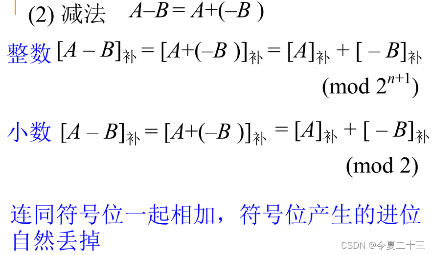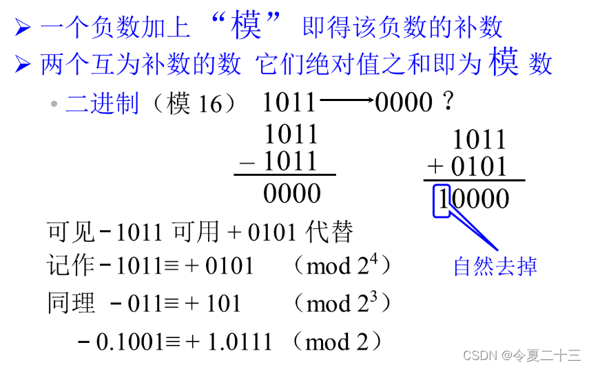 由此可以知道,只要确定了模,就可以为任何一个负数找到与其对应的正数,也就是补数,这样就方便进行运算,在对含有负数的式子进行加法运算时,可以先将负数取补数,最后取模即可。