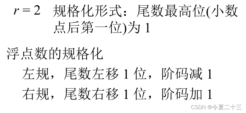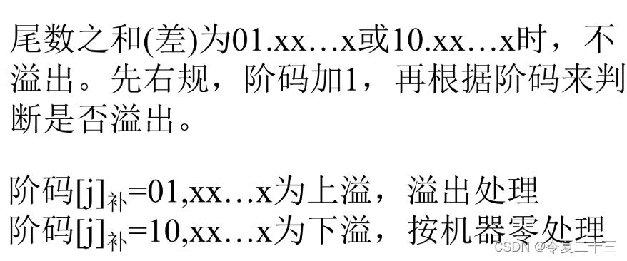 当尾数出现 01.xxx...x 或 10.xxx.x 时,表示尾数溢出,需要进行右规。每次右规时,视最高位(左边符号位第1位)为真正的符号位,该位不变,其余位(含左边第2位)右移一位,阶码加一。注意负数补码右移要添1。