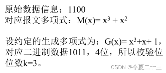 首先,要根据题目所给的原始数据信息得到对应的报文多项式,还要根据约定的生成多项式得到对应的二进制数据,再将该数据的位数减一,得到校验位数k;