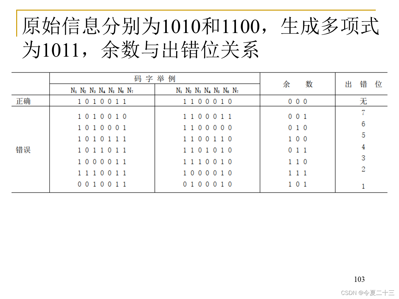 题目会给出用二进制数表示的原始数据信息和约定的生成多项式,经过计算后可以得到校验位,若校验位为0,则说明无错,若校验位不为0,则说明有错。
