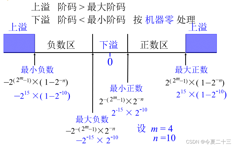 - 当浮点数阶码等于或小于它能表示的最小数时,不论尾数是多少,按机器零处理