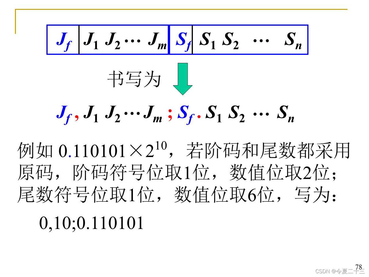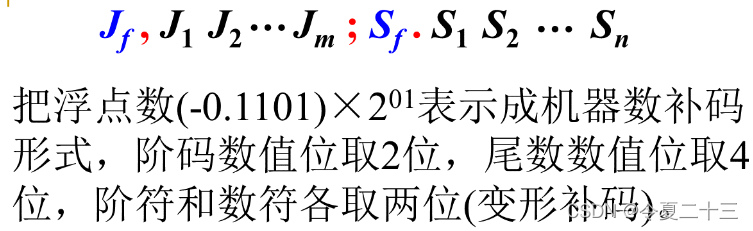 注意这里的格式和上面的浮点数表示法不同,这里的第一个符是数符,也就是表示这个数字正负发符号,而非阶符,阶符包括在阶码里面!