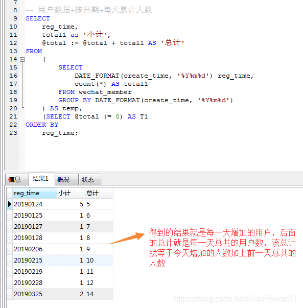 前言:公司项目需要做数据可视化,统计一些数据,比如用户增长量,按每天分组,还要计算每天累加的用户量,一开始也是想了很久,不知道怎么做,后面 百度的,找打了一个解决办法。