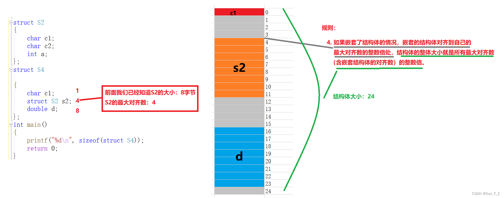 如果嵌套了结构体的情况,嵌套的结构体对齐到自己的最大对齐数的整数倍处,结构体的整体大小就是所有最大对齐数(含嵌套结构体的对齐数)的整数倍。