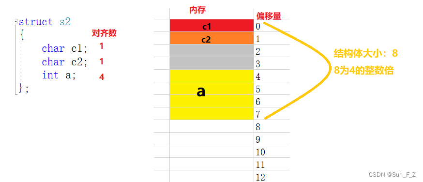 3. 结构体总大小为最大对齐数(每个成员变量都有一个对齐数)的整数倍。