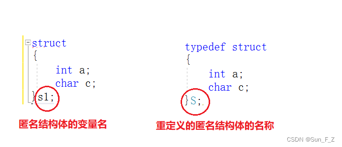 因为是匿名结构体,省略掉了类型名,所以无法在其余位置定义变量,只能在这后面定义。