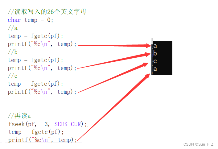 fseek(pf, -3, SEEK_CUR);//指针-3回到a的位置