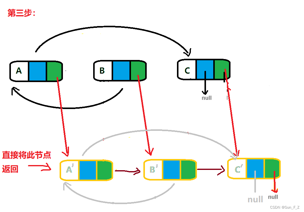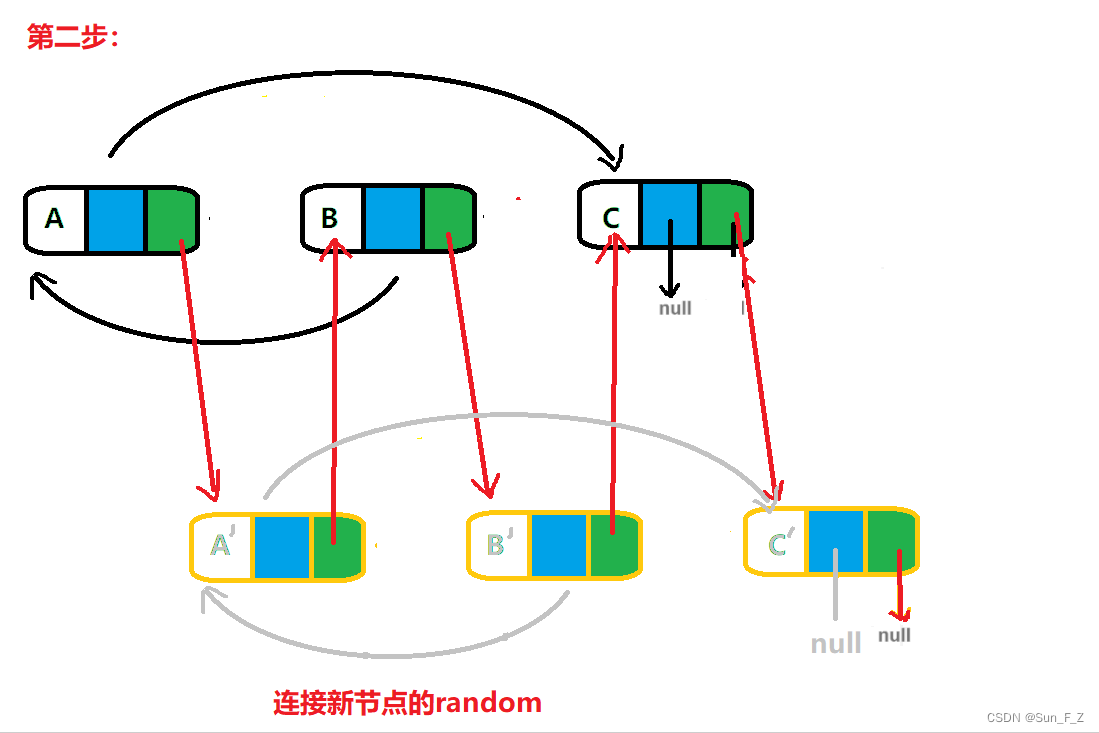 第二步,将新节点中的随机指针 random,按照旧节点的连接关系,对应的 依次连接。