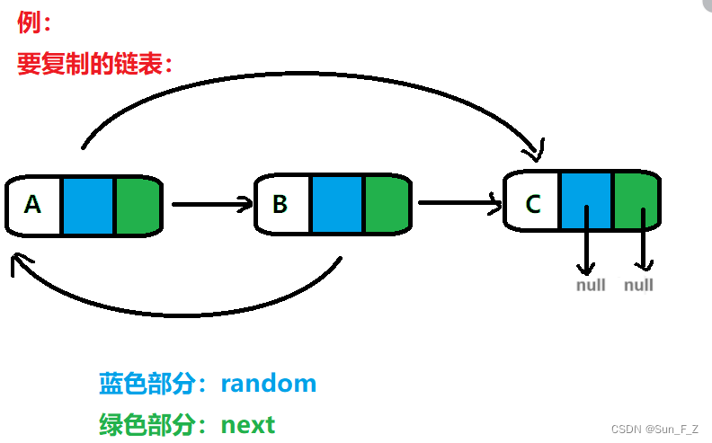 构造这个链表的 深拷贝。 深拷贝应该正好由 n 个 全新 节点组成,其中每个新节点的值都设为其对应的原节点的值。新节点的 next 指针和 random 指针也都应指向复制链表中的新节点,并使原链表和复制链表中的这些指针能够表示相同的链表状态。复制链表中的指针都不应指向原链表中的节点 。