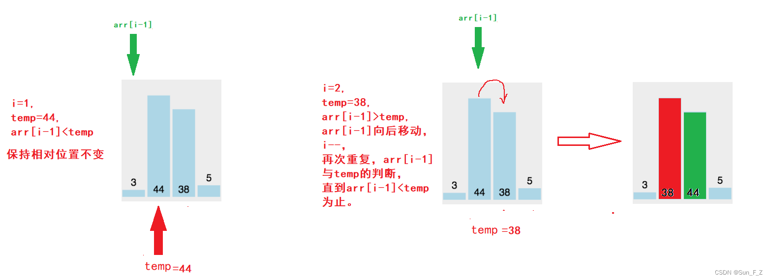 end记录下标 i-1 ,temp记录要插入的数,当a[end]>temp时,将a[end]的数向后移动一位,同时下标end向前移动一位,更新a[end]。直到找到temp的位置或end越界,停下将temp放到a[end+1](end我们已经进行 -- ,空出来的位置应是end+1)的位置上去。如此反复的一个一个插入就变得有序。