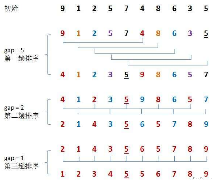 每一次都跳跃式的排序,这样可以将有些数更快速的排到应该在的位置。最后,当gap=1时,这个数组就已经接近有序了,再次进行排序就会方便很多(因为有的数就不需要挪动)。我们将gap>1时的排序叫做预排序,gap=1时就是插入排序了。