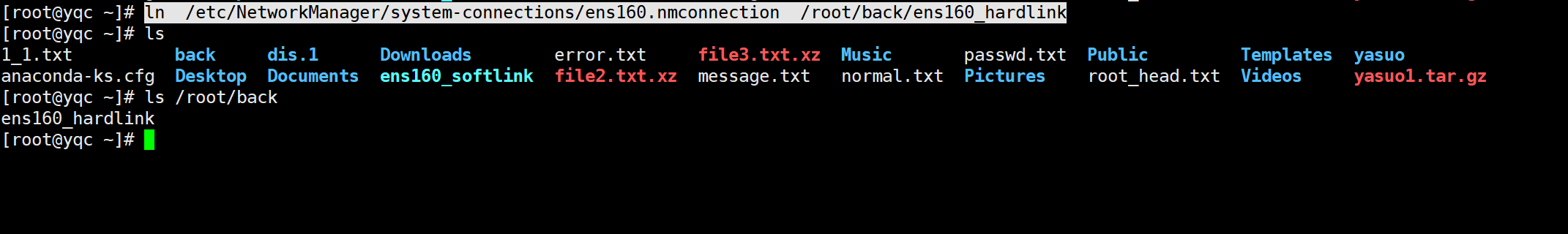 一、给ens160.nmconnection文件创建软链接到root用户的家目录下,创建硬链接到root用户家目录下的back目录。然后分别查看软硬链接的属性信息和文件类型